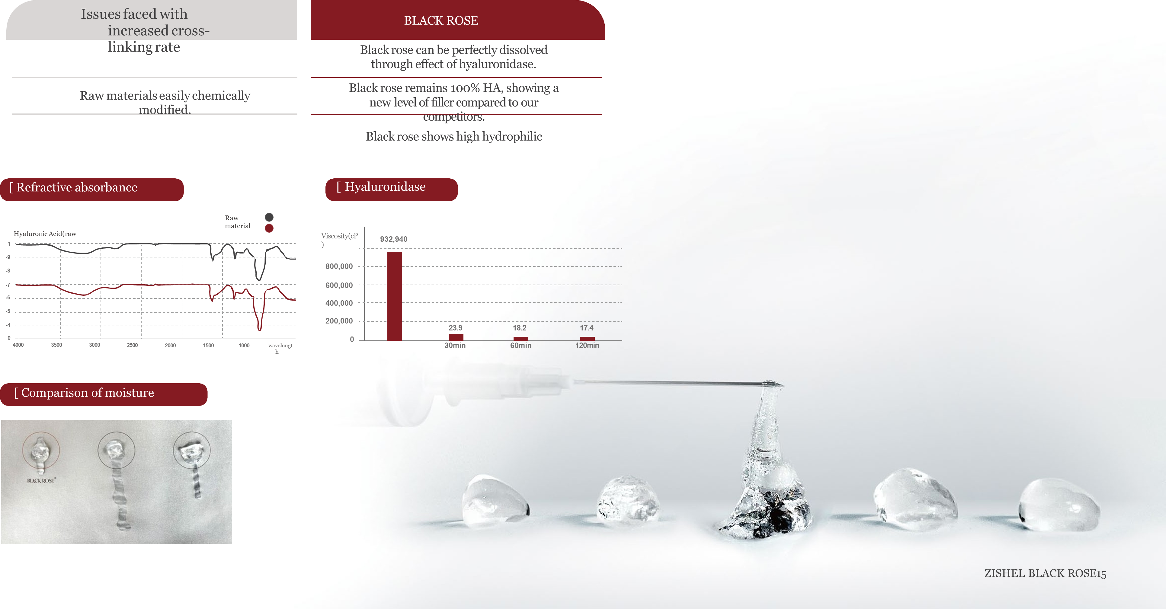 BLACK ROSE با استفاده از فناوری نوآورانه چند مرحلهای پیوندی مشکل دوام کوتاه فیلرهای HA معمولی را حل کرده است. این فناوری منجر به ایجاد اولین فیلر نیمه دائمی HA در جهان با خاصیت خوب مواد شده است.